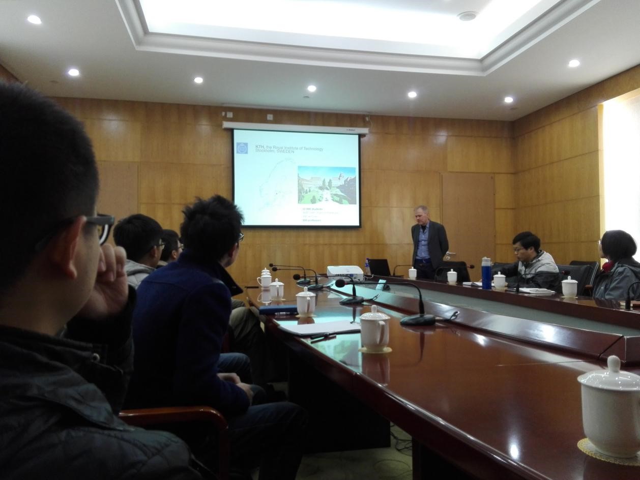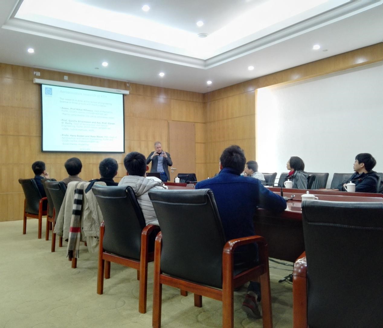 Mats Abom教授首先对瑞典皇家理工学院及他所在实验室的相关情况做了介绍。随后Mats Abom教授介绍了他们实验室的主要工作,他从管道声学方面的数值模拟讲起,包括对加入湍流影响的声场计算,针对压气机应用的数学建模和气动设计,以及对声衬的一些研究,整场报告思路清晰,内容丰富精彩。与会的老师和同学们就报告内容进行了充分的讨论和提问,随后Mats Abom教授对师生提出的问题耐心地一一作答,并鼓励同学们多质疑多讨论,只有这样才能开拓自己的思路,激发同学们的创新思维。本次报告历时两个半小时,最后在同学们热烈的掌声中画上了圆满的句号。(文图/郑黎达)